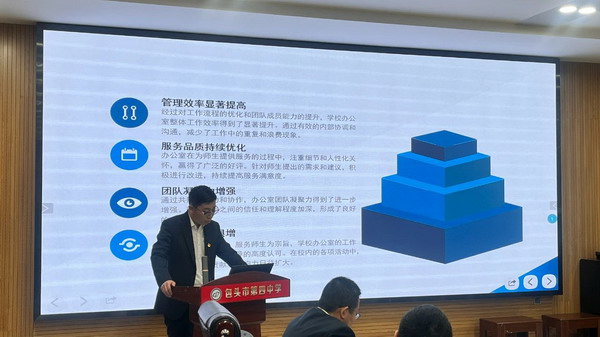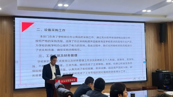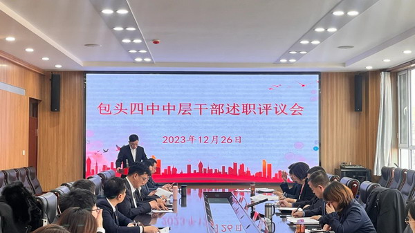 为加强中层干部队伍建设,提升干部履职能力,更加全面、客观、公正、准确地评价学校中层干部的业务素质及履职情况,激发其工作的责任感使命感,12月26日下午,包头四中在崇德楼会议室举行2023年度中层干部述职考核评议会。全体校领导和行政会干部参加会议。会议由办公室副主任张富主持。
