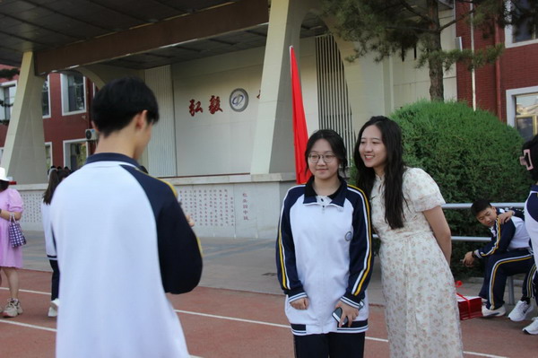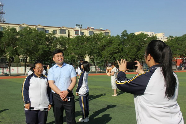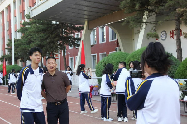 鲍旭东老师代表高三教师发言。“同学们,今天请你再次抚摸胸口的校徽,曾经它用三年的时光,陪伴每一颗滚烫的心脏。如今大家即将天各一方,无论未来遇到什么事情,希望在四中的这段经历,都能给你内在的精神力量——因为‘弘毅博雅’的精神,早已刻进你的胸膛!”